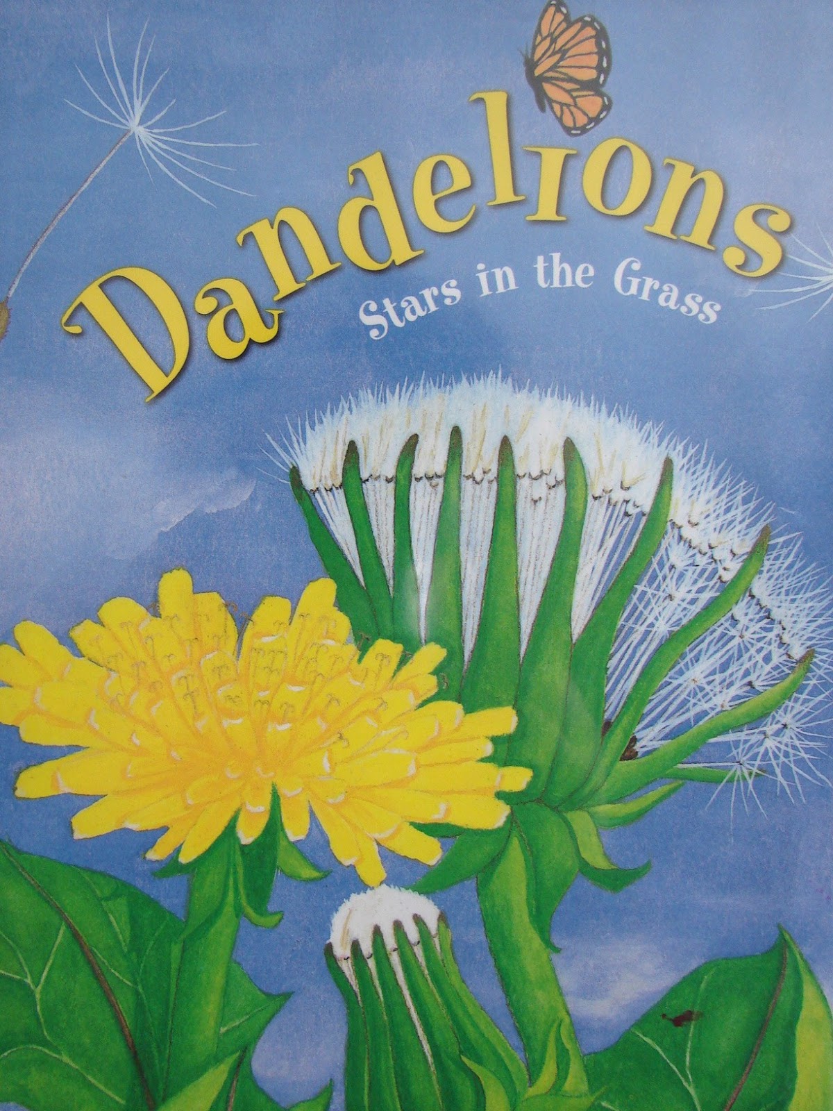 "Dandelions: Stars in the Grass" is written and illustrated by Mia Posada. There is extra information about dandelions at the end of the book, along with a recipe for a dandelion salad, and a few science experiments and observations.